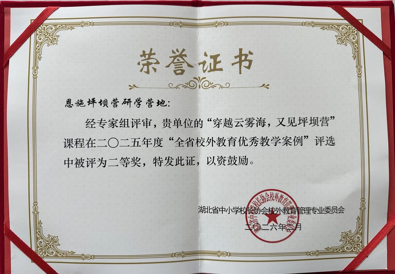 此次营地荣获的具体奖项包括:湖北省坪坝营旅游发展有限公司被授予“2025年度湖北省校外教育工作先进单位”称号;营地高级研学导师覃慧获评“2025年湖北省校外教育先进个人”;营地自主研发的课程“穿越云雾海,又见坪坝营”之《奇幻喀斯特,奥妙水物语》荣获“2025年度全省校外教育优秀教学案例”二等奖。