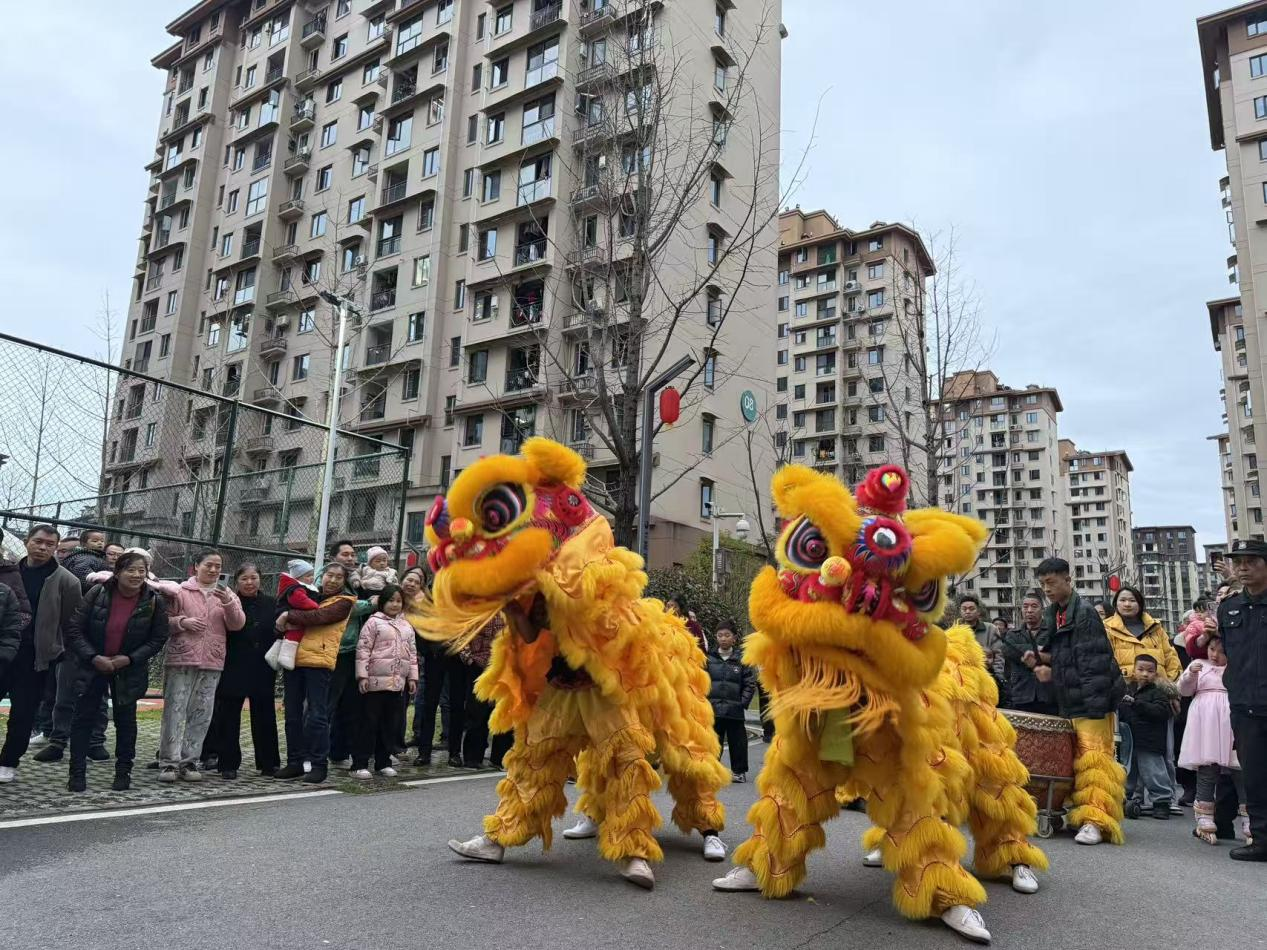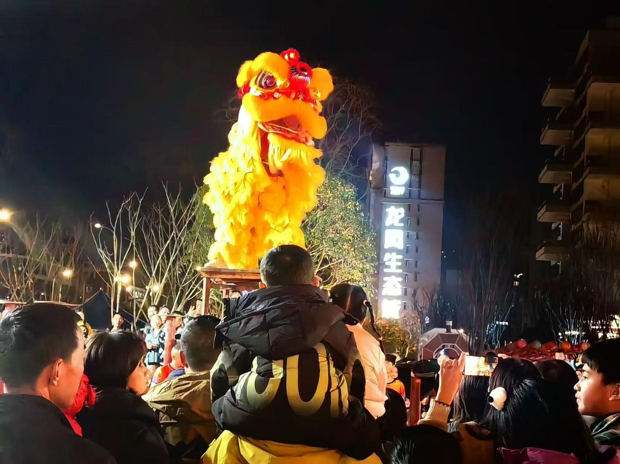 夜幕降临,园区内灯火璀璨,氛围热烈祥和。专业舞狮团队穿梭于龙凤生态城各园区之间,彩狮随喜庆鼓点腾跃翻转、姿态灵动,时而昂首探路尽显昂扬气势,时而俯身拜年传递美好祝福。舞狮队沿途向业主们派发糖果、小红包,引得老少业主纷纷驻足观赏、喝彩不绝,孩童们追随着狮队奔跑嬉戏,清脆笑声回荡园区。在壹号院营销中心前广场,精彩纷呈的舞狮梅花桩表演将气氛推向高潮,雄狮腾挪跳跃、威风凛凛,寓意吉祥如意,业主们争相上前“摸摸狮子头”,沾福气、祈平安,掌声与欢笑声此起彼伏。