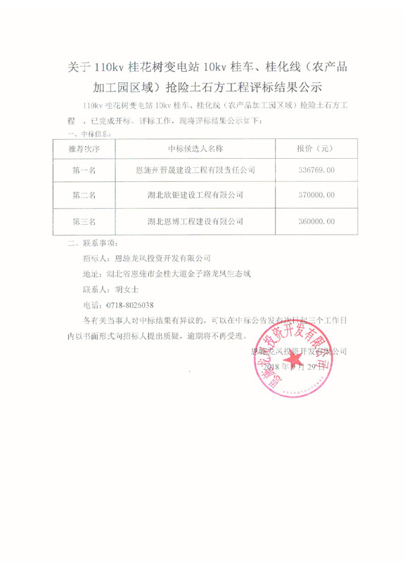 关于110kv桂花树变电站10kv桂车、桂化线(农产品加工园区域)抢险土石方工程评标结果公示