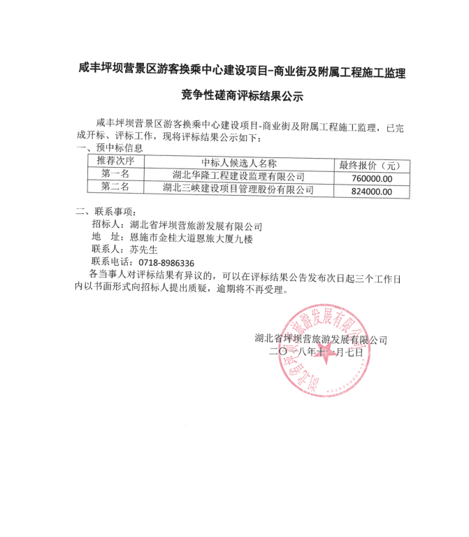 咸丰坪坝营景区游客换乘中心建设项目-商业街及附属工程施工监理竞争性磋商评标结果公示
