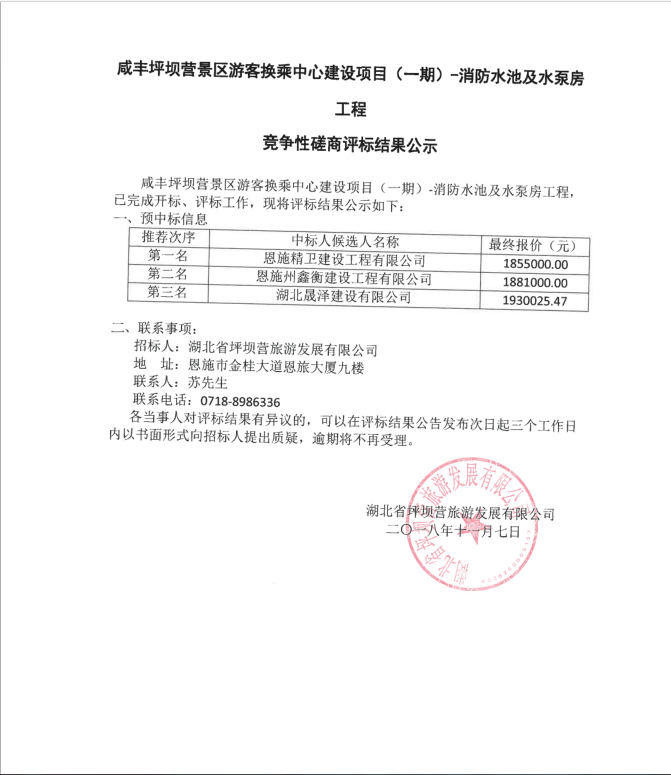 咸丰坪坝营景区游客换乘中心建设项目(一期)-消防水池及水泵房工程竞争性磋商评标结果公示
