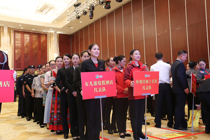 工装礼仪比赛环节,女儿寨度假酒店代表队按照行业标准以甜美的微笑、优雅的姿态、特色的着装和标准的动作,通过服务情景模拟,将酒店礼仪规范全方位展示。“当班理云鬓,对镜照佳人,宛然一笑间,春风满寨盈”是他们职场素养的写照,“戎装礼待四海宾,素颜巧下三餐厨,双目流盼处处喜,十指灵动样样舒”是他们敬业奉献的诠释。最终女儿寨酒店斩获第二名,被授予“最佳仪态奖”。