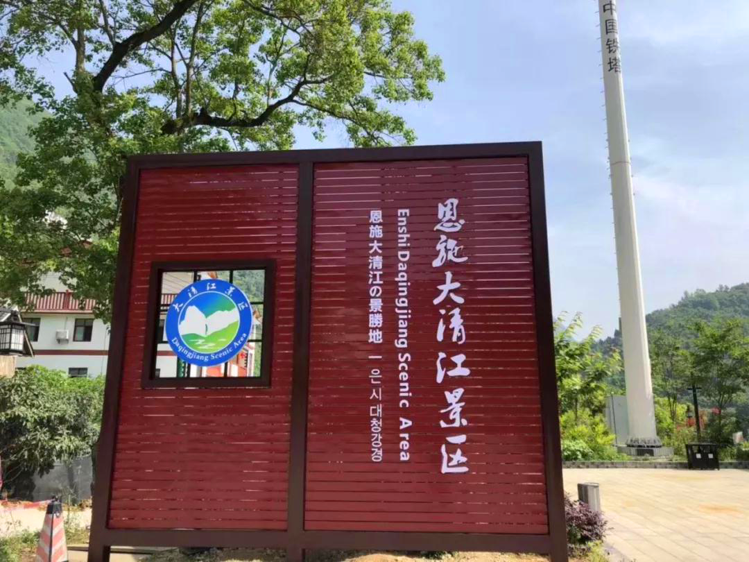 主题宣传墙上主要元素包括恩施大清江景区logo,以及恩施大清江景区名称的中文版、英文版、日文版和韩文版,代表景区秉承鄂旅投布局全域市场、广迎全球宾客的发展理念。