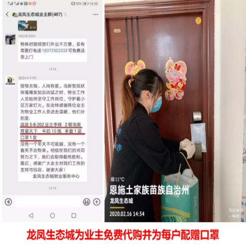 与此同时,线上线下同步强化对疫情防控知识的宣传。不仅在官方微信公众平台及时发布新鲜的疫情防控基础知识;而且在线下,通过公告栏、横幅等多渠道发布疫情疫情防范要点,提高业主的安全防控意识。另外,在本地防疫物品断货的情况下,龙凤生态城想方设法从外地采购了一批一次性医用口罩,按每户10个的标准免费配发给业主(为避免与业主产生接触,工作人员先微信群发通知,再将口罩用透明胶粘贴在业主门上,敲门提醒业主自取),确保每一户家庭足以自我防护。