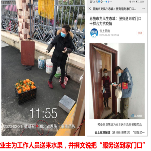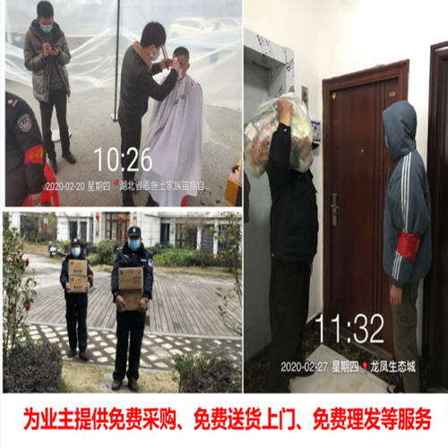 疫情当前,对于每一个人来说,家最是安全、温暖的所在。为保障生活,服务业主,龙凤生态城还衔接小区配套的生活超市在疫情时刻,推出送货上门服务,蔬菜水果、日用百货、干货粮油,不仅货源充足,免费配送,而且承诺所有单品绝不涨价。全力抗“疫”,温暖相伴。疫情防控开展以来,小区秩序班组的全体队员每天都坚守按时上班,公交车停运后,45岁的谭育之每天步行一个多小时上下班,保洁阿姨胡志名每天更是要步行两个多小时才能到小区,但他们没有迟到过一次。他们默默的付出,赢得了业主的赞许,业主们纷纷主动为工作人员送来水果、送来零食、送来热水壶,甚至在媒体撰文称“龙凤生态城把服务送到了家门口”,这是最特殊的授奖礼,是对龙凤生态城深耕恩施最荣耀的赞誉。