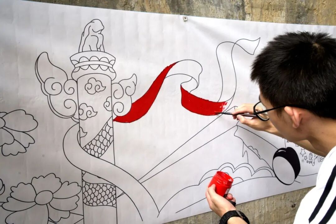 活动现场铺设的长卷以"锦绣中华"为主题,设置了多个绘画区域。游客们自发参与创作,或调色勾勒,或细心描绘,共同在长卷上绘制五星红旗、祥云、火箭等象征国家发展的图案。