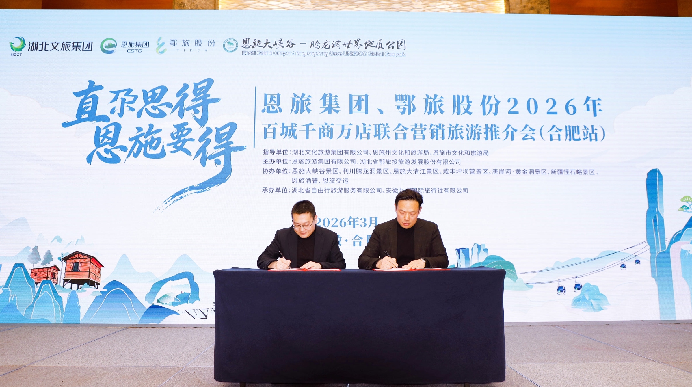 签约仪式上,恩旅集团与安徽渠道伙伴签署合作协议。与会渠道商表示,2026年将积极组织安徽游客赴恩施旅游,感受夏日清凉,体验土家摔碗酒等民俗文化,领略恩施山水风光。
