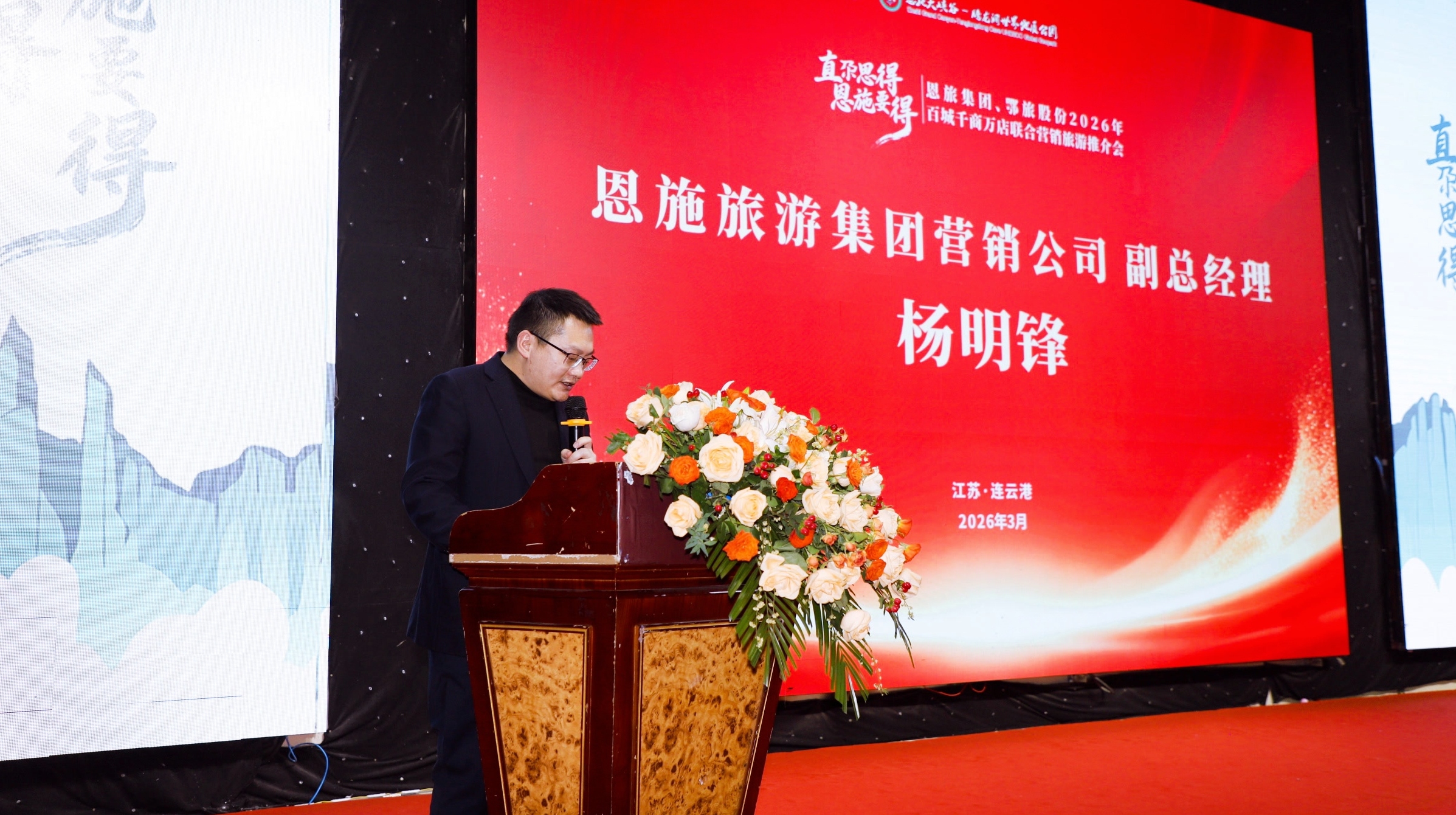 在连云港,恩旅集团营销公司副总经理杨明锋出席并致辞,向与会嘉宾介绍了恩旅集团、鄂旅股份旗下核心景区群的迭代升级与2026年产品规划,并现场公布了渠道激励政策。他表示,恩施与连云港虽相隔千里,但山海相连、人文相通,合作空间广阔。诚邀连云港旅行商及游客走进恩施,体验独特的自然风光与民俗文化。