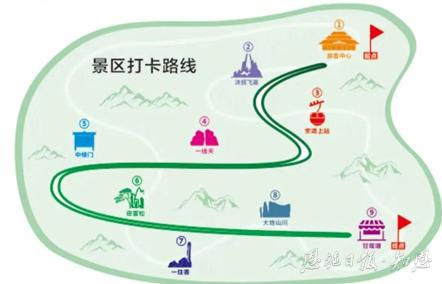 打卡路线:新游客中心广场—沐抚飞瀑—索道上站广场—一线天打卡点—中楼门休息点—迎客松观景平台—一炷香观景平台—大地山川观景平台—甘堰塘返程中心共9个打卡点。