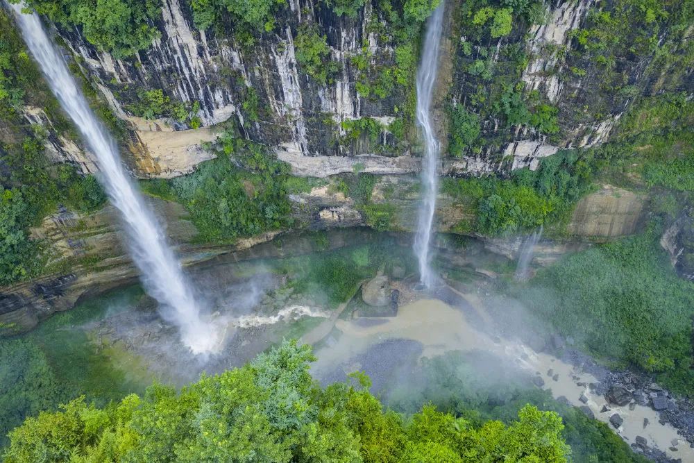 2025年8月11日拍摄的恩施大峡谷雨后瀑布景观。(无人机照片)CICPHOTO/杜维 摄