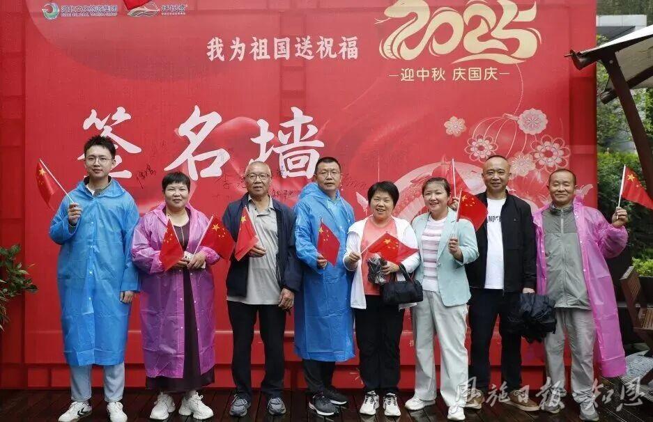 景区入口处,“我为祖国送祝福”签名墙前排起长队,游客们欣然提笔,在签名墙上留下一句句真挚的祝福。笔墨之间,是人们对祖国的深切热爱;展板之上,是万千游客共同绘就的爱国画卷,现场洋溢着热烈而温馨的节日气息。