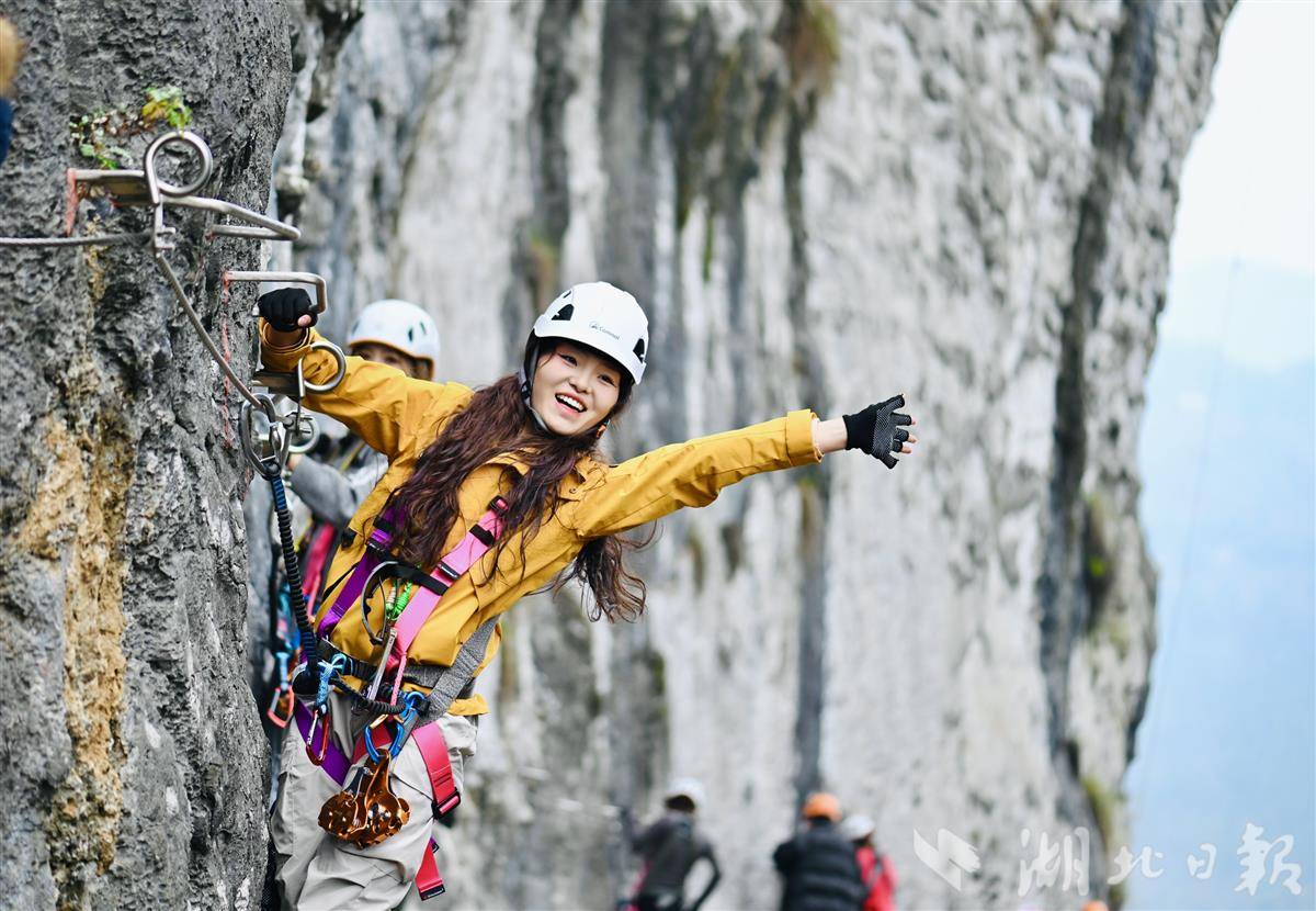 2月4日,游客在恩施大清江红花峰林景区体验飞拉达攀岩。