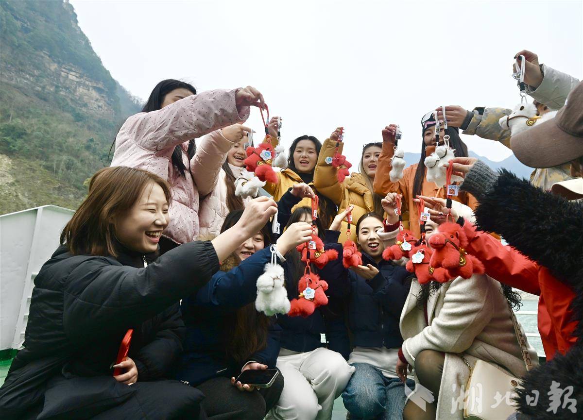 2月4日,游客在恩施大清江游轮上领取到小马玩偶礼物。湖北日报丨恩施各景区迎来节前旅游热潮
