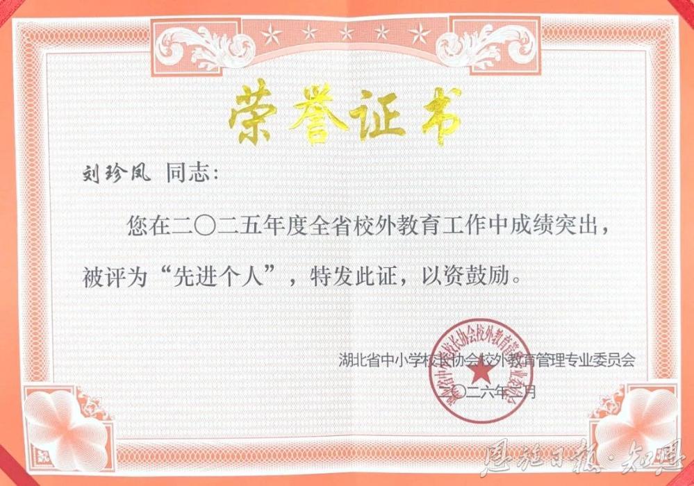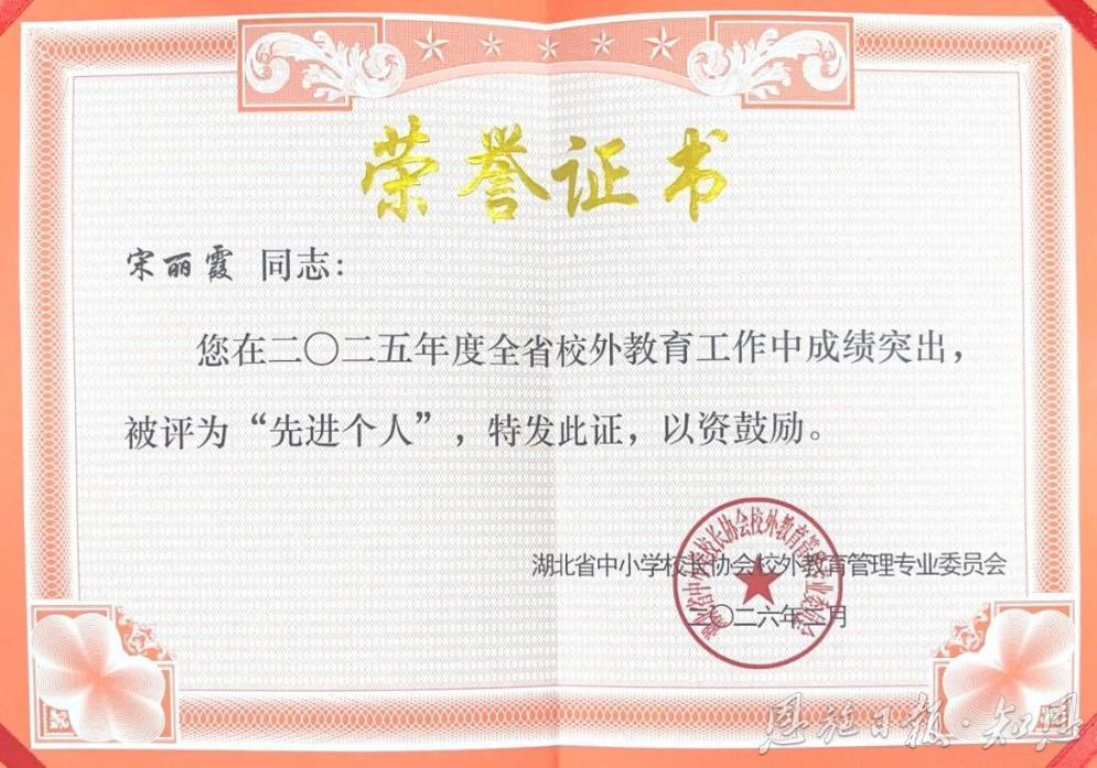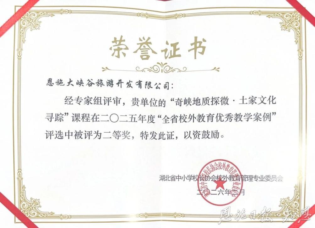 营地被授予“2025年度湖北省校外教育工作先进单位”称号;其自主研发的《奇峡地质探微·土家文化寻踪》课程,在“2025年度全省校外教育优秀教学案例”评选中荣获二等奖;营地刘珍凤、宋丽霞两位同志因工作实绩突出,获评“2025年度全省校外教育先进个人”。