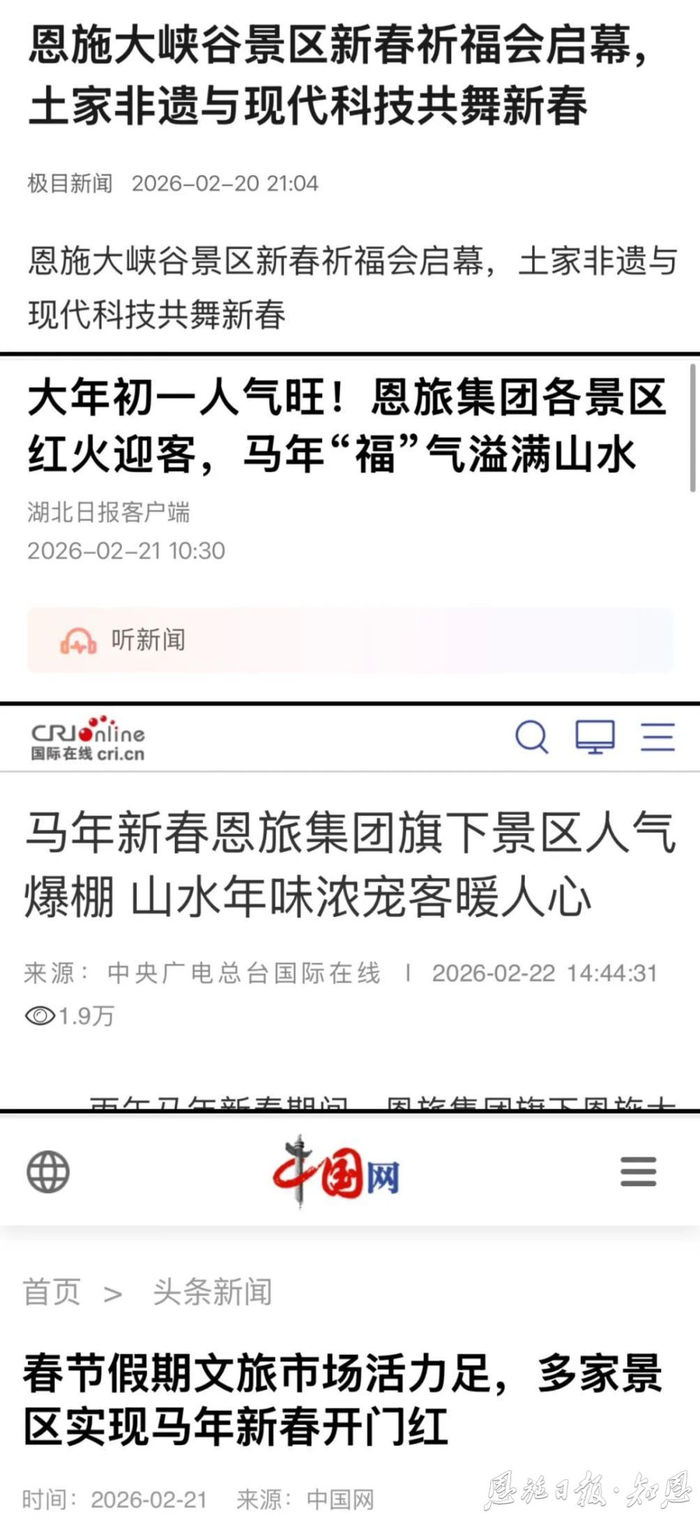 与此同时,恩旅集团的春节故事也在各大主流媒体持续刷屏。国际在线、极目新闻、湖北日报等媒体对旗下各景区春节活动进行集中报道;云上恩施、恩施日报等本地平台持续聚焦各景区客流盛况。从央媒到省媒,从传统媒体到新媒体平台,恩旅集团的新春宣传形成传播合力,让“恩施过大年”的品牌影响力持续升温。