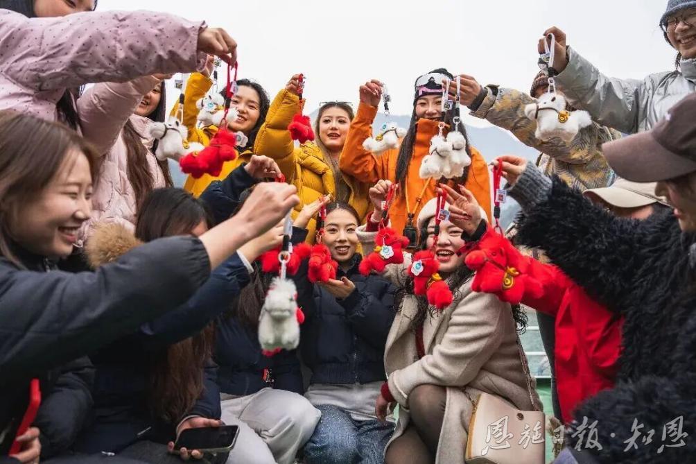 恩施大清江的游船上,工作人员为游客送上红色小马挂件,将“新年快乐,马年大吉”的祝福随船远航。