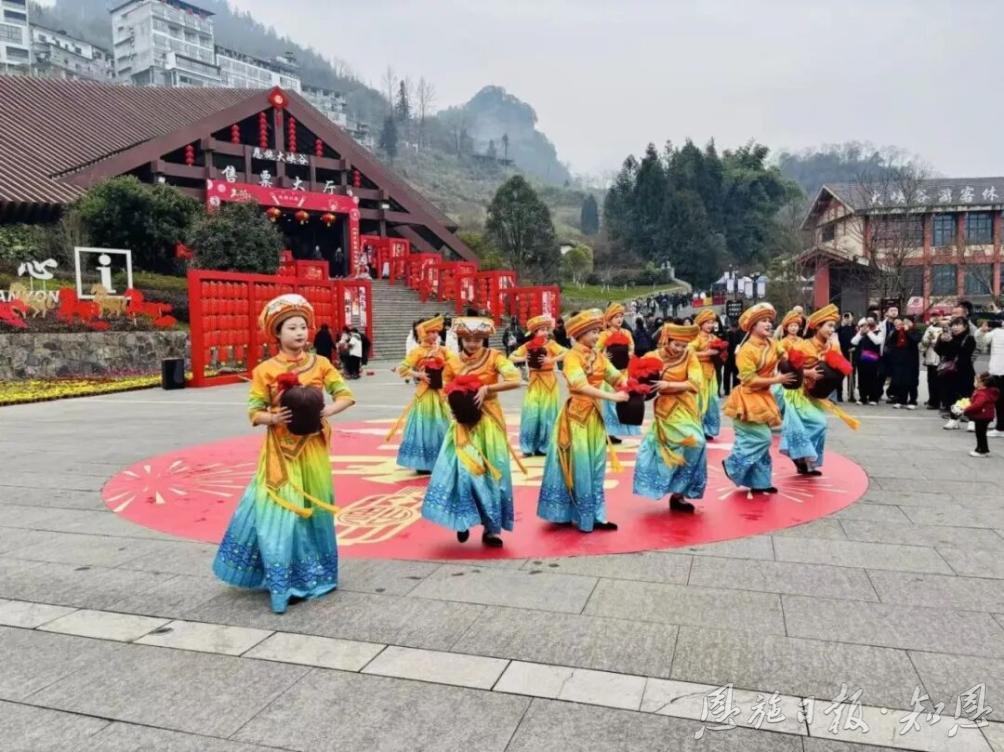 大年初一,恩施大峡谷“峡谷纳福·万福迎春”新春祈福会在欢快的土家开场舞《逮嘎嘎》中拉开帷幕。千年非遗傩舞复原表演惊艳全场,傩面舞者古朴苍劲的动作承载着土家先民驱邪纳福的千年文脉;《龙船调》婉转悠扬,《云里土家》将西兰卡普织造技艺融入舞蹈,让游客沉浸式领略土家族独有的人文魅力。