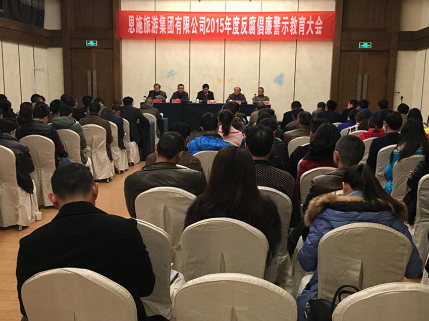 2015年11月26日上午,恩旅集团召开了2015年度反腐倡廉警示教育大会,此次大会的召开即是落实恩旅集团年初确定的党风廉政建设的重点工作,也是做好年底各项工作的重要内容之一,其主要目的是通过警示教育,切实增强企业员工的廉洁自律意识,筑牢拒腐防变的思想。会议邀请了恩施州检察院副检察长张寿齐、恩施市检察院副检察长向阳、恩施市反贪局局长郭峻出席。本次反腐倡廉警示教育大会由恩旅集团党委书记周永彪同志主持,恩旅集团党委班子成员、中层干部、各二级单位经营班子、中层管理干部、工程、财务、采购、营销等共计150余人参加了本次大会。