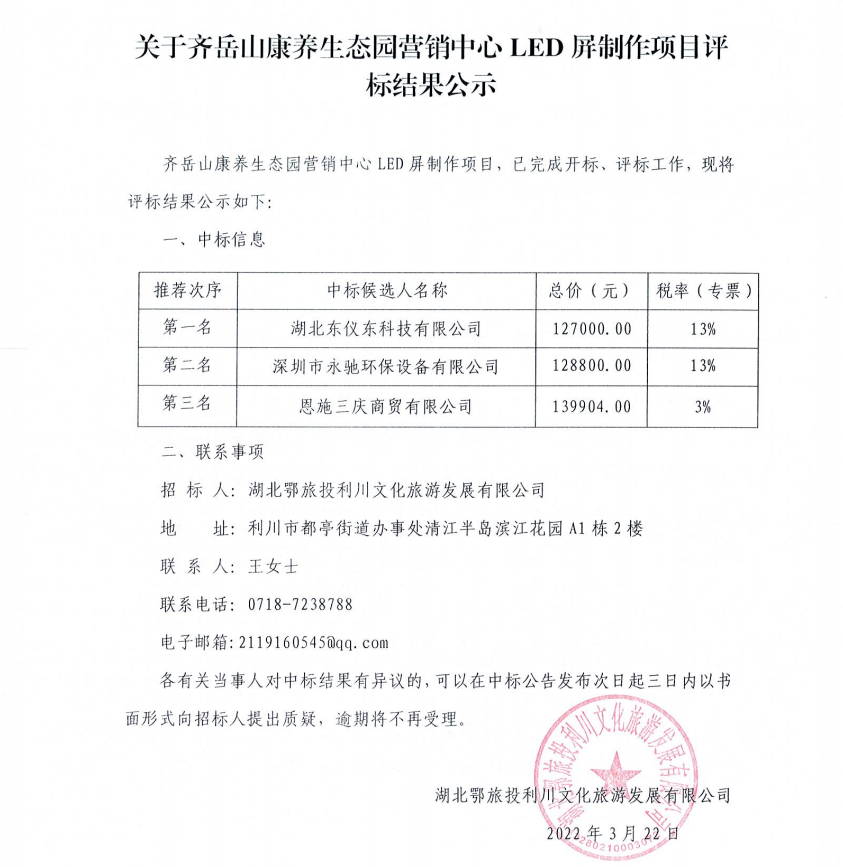关于齐岳山康养生态园营销中心LED屏制作项目评标结果公示