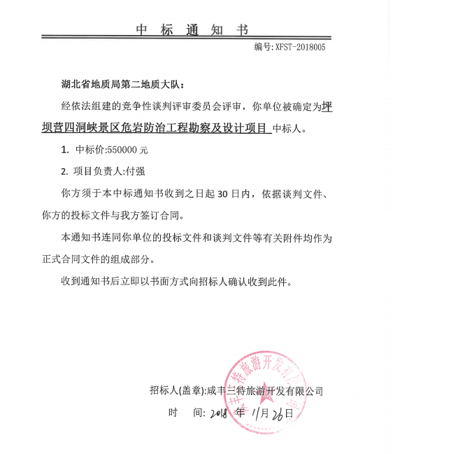 坪坝营四洞峡景区危岩防治工程勘察设计项目中标通知