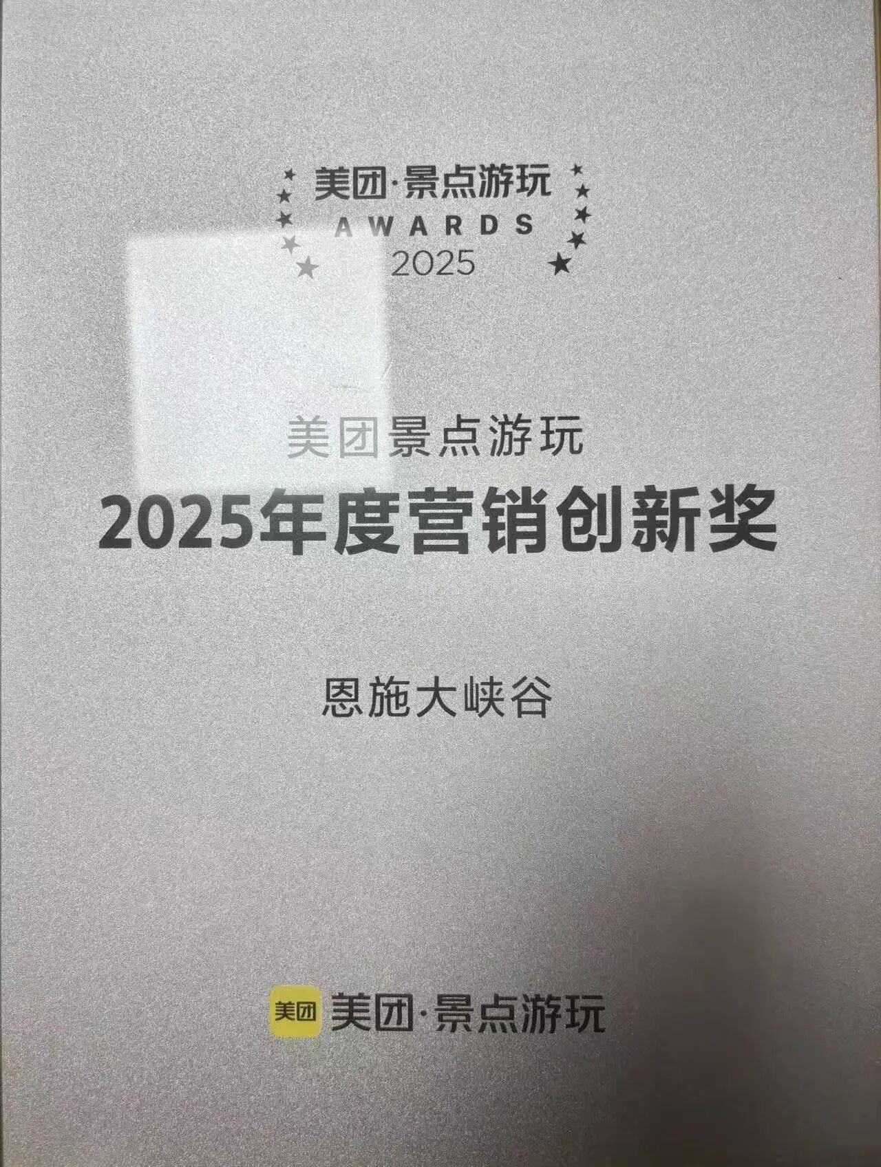 近日,恩施大峡谷景区凭借其突出的科技创新与数字化实践,荣获美团景点游玩“2025年度营销创新奖”。该奖项旨在认可景区在“科技+旅游”融合营销方面的成功探索,彰显了其以创新体验驱动发展的实践成果。