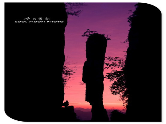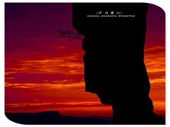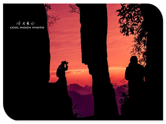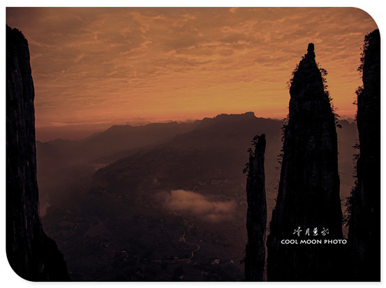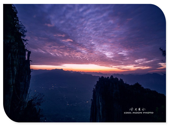 当我们沿着蜿蜒的石径,攀上山顶,此时天地还是一片混沌。丛山黯暗,紫雾漠漠。
